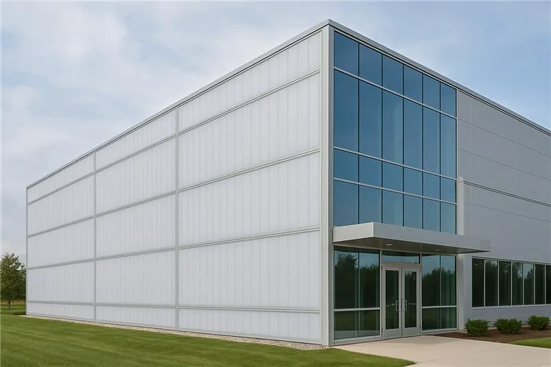 Polycarbonate façade solution with a clean-line, interlocking panel design.